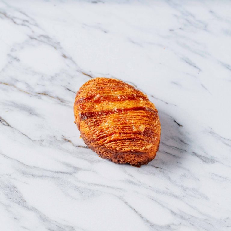 青森県産紅玉のキャラメリゼを中に忍ばせブリオッシュフイユテの層で模様を表現しました。
