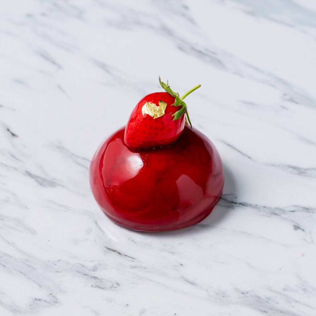濃厚なピスタチオクリームに、キルシュの華やかな香りと木苺果汁100%のジュレが重なる繊細な味わい。旬の苺をふんだんに使用した贅沢な一品。